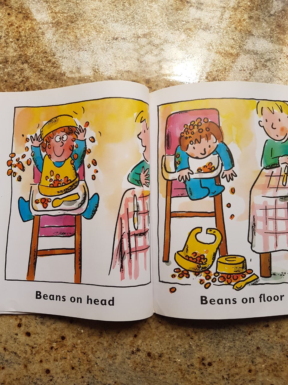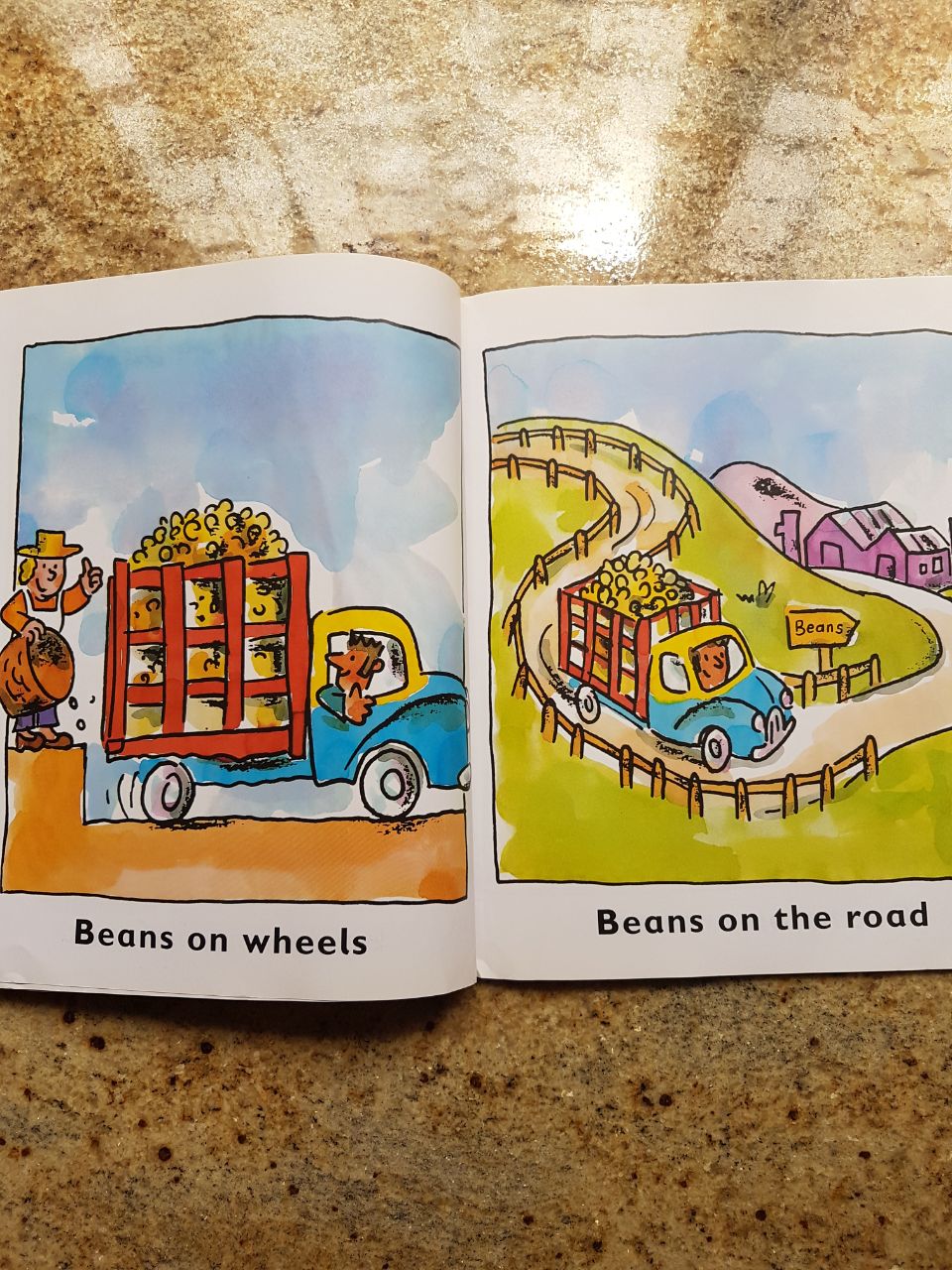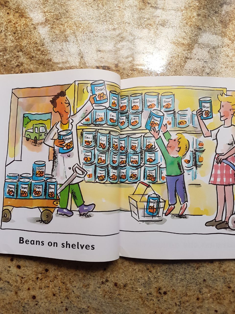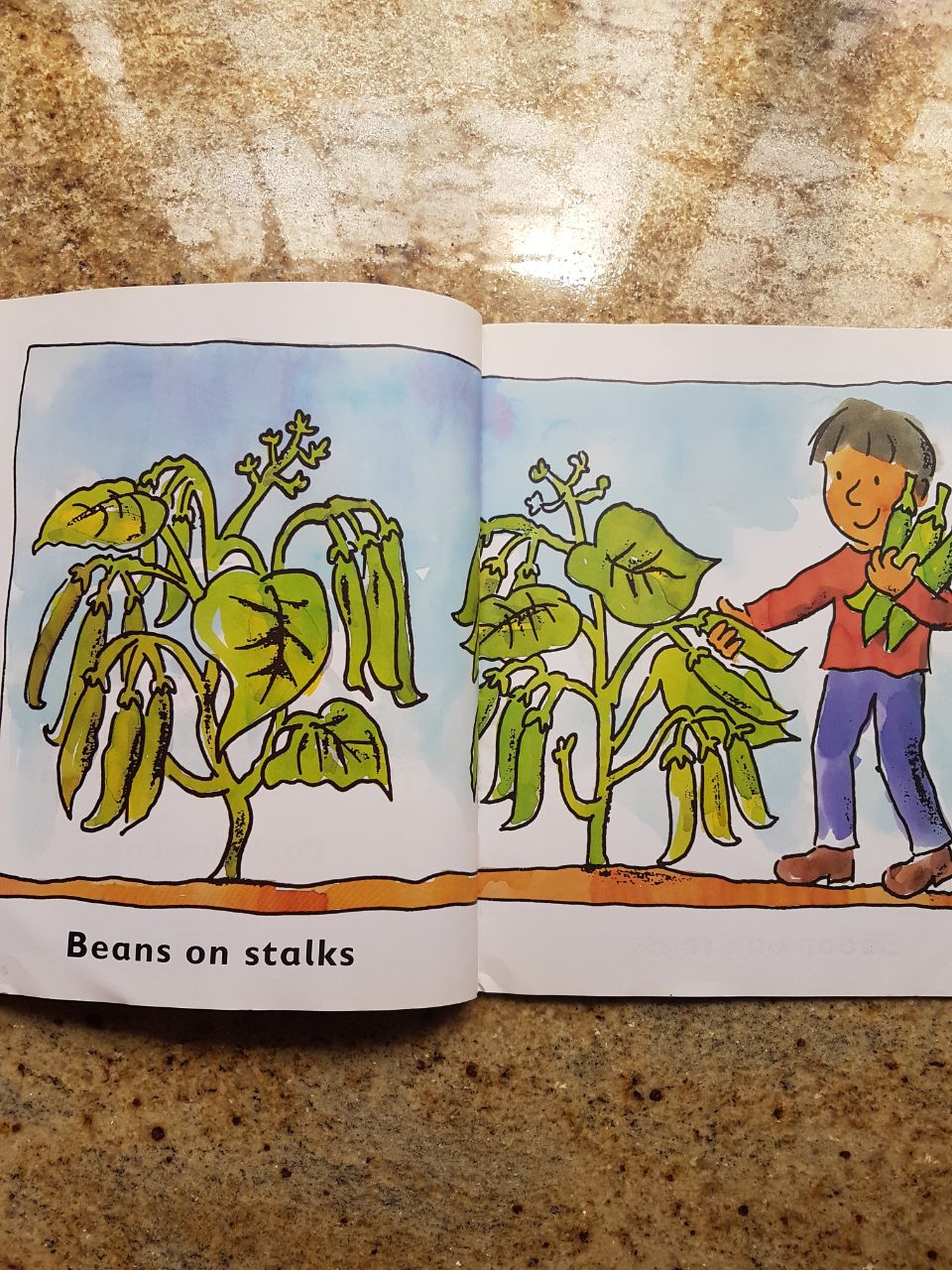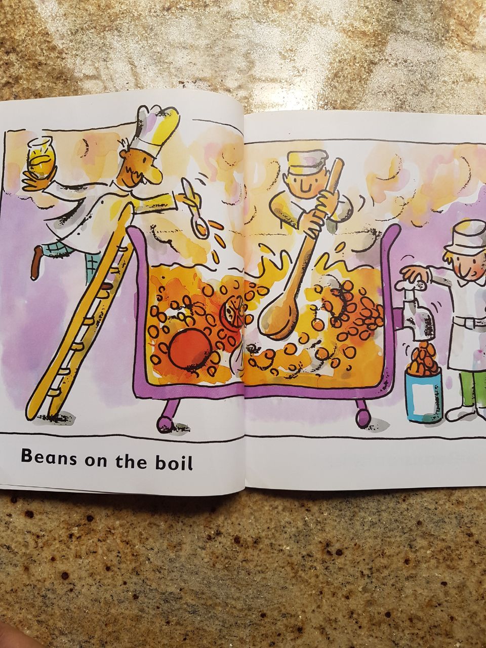 BabyT even insisted on me giving him some French beans which he opened to remove the seeds and then physically transported the seeds from page to page – from the truck to the boiling cauldron to the shelf to the shopping basket. Like the whole process made sense to him.