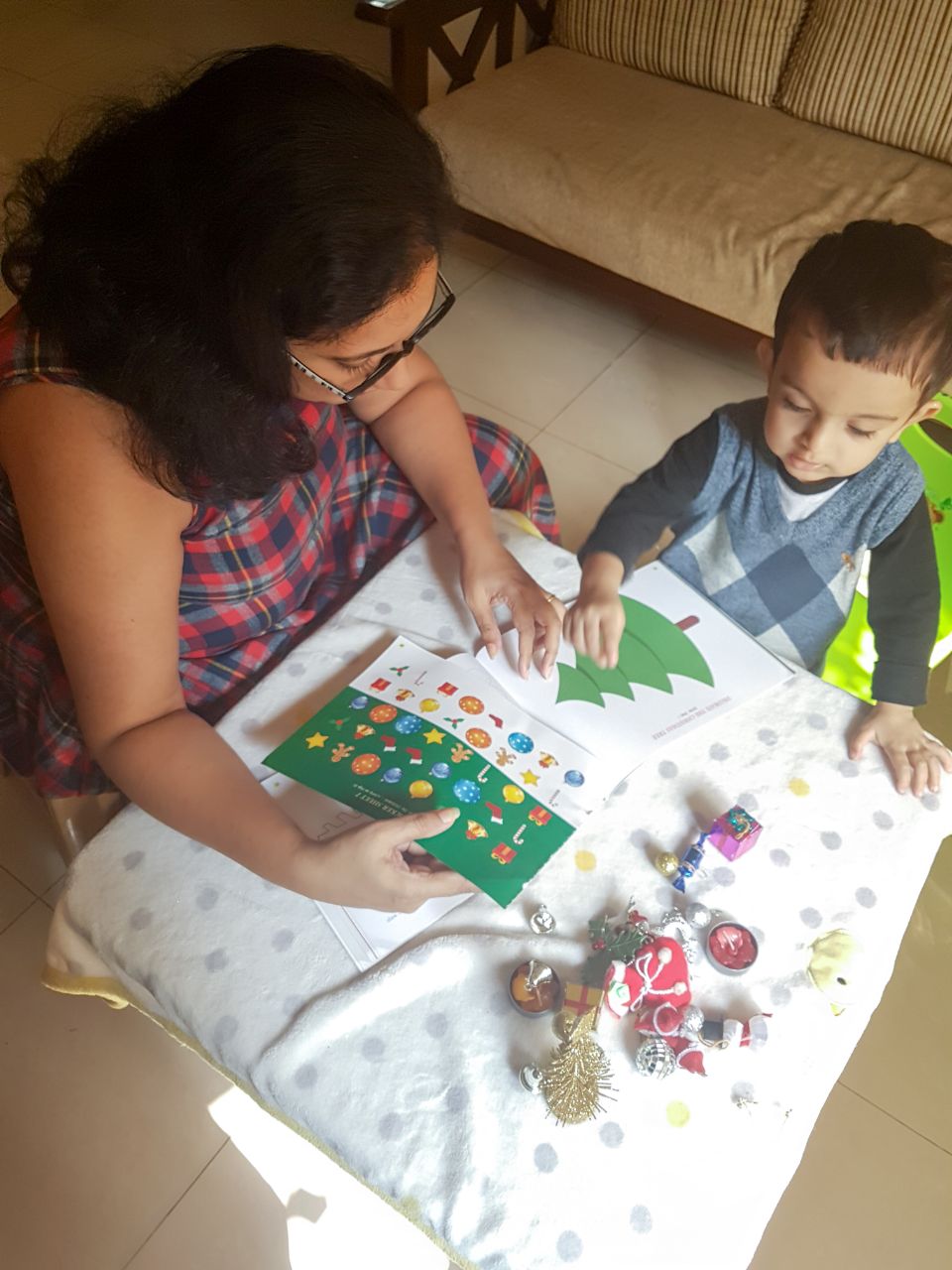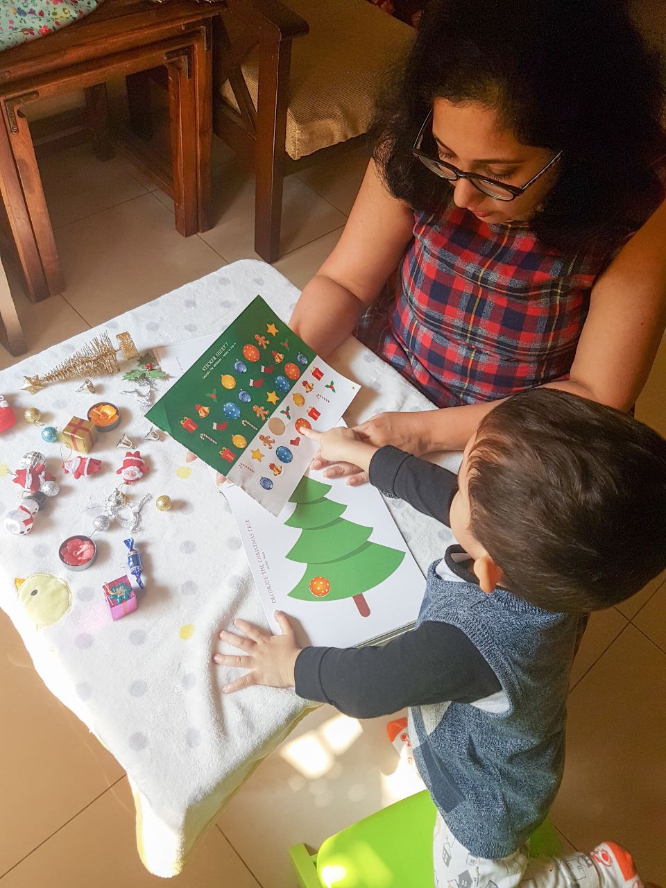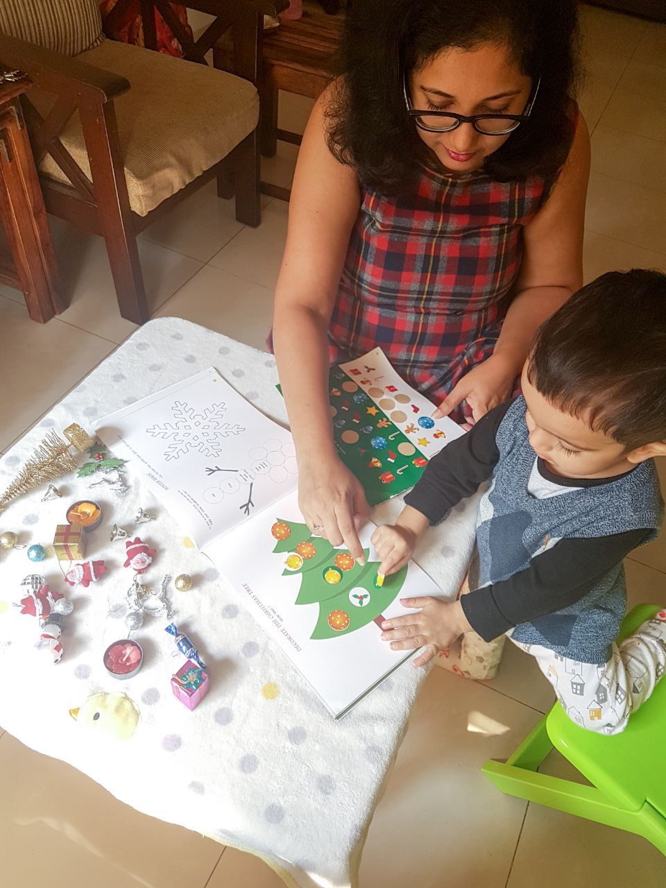 One of our favourite activities was decorating the Christmas tree with stickers. Yes, the Christmas tree and the stickers are all provided in this book. Look at what a great time we had…