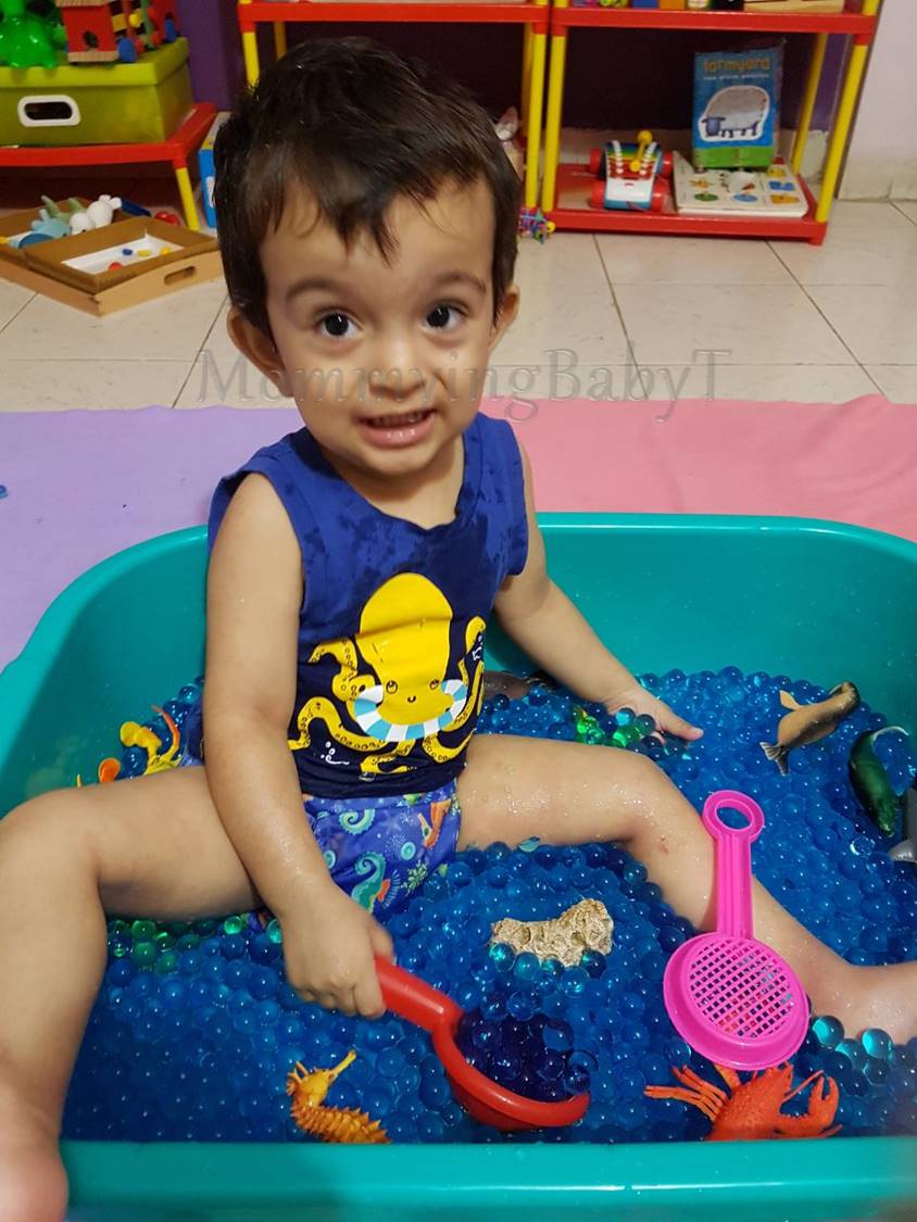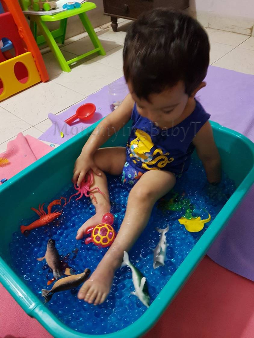 He indulged in splashing about in the watery mess, squeezing the squishy water beads and holding the cold ice cubes in his palm until they were too cold for his tiny hands. He then began fishing the sea creatures, saying their name out loud and then placing them on the mat outside. He used his beach kit to play with the water beads and poured them about in the tub, sieving them and watching the water drops trickle down and the beads remain in the sand sifter.