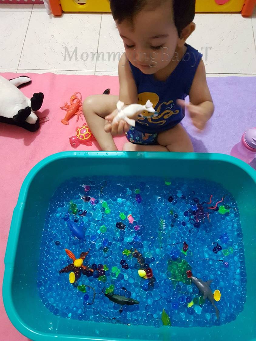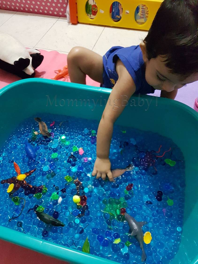 Eventually, he sat down inside the sensory and kicked about, thus getting a top to toe sense of the water beads and the sea creatures in it. He even proclaimed that he was Sailor Sammy, a character from his favourite book “Boats Sail Away” BabyT did get a lot of water beads down his shirt and inside his diaper but nothing that a warm bath after our play couldn’t clean.