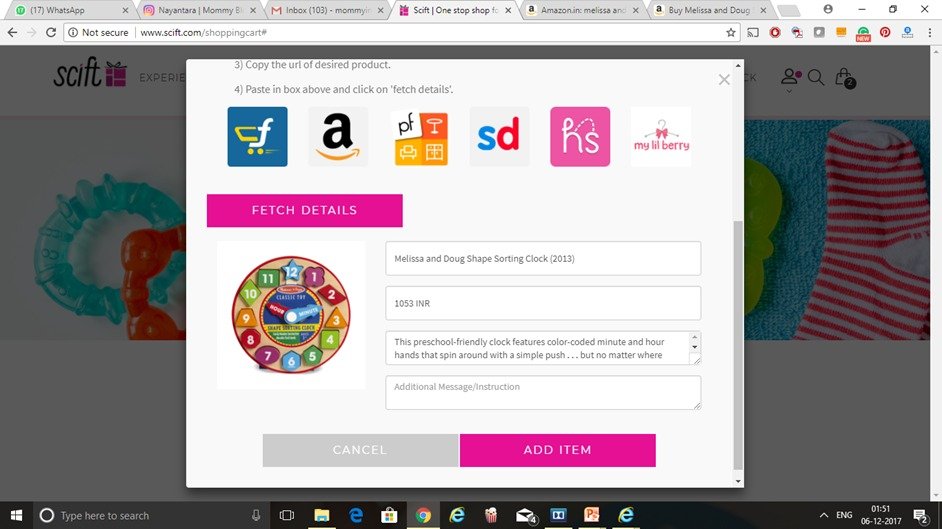 So when there were a few Hape and Melissa & Doug toys which I was hoping for T to have, I added them to my gift registry on Scift via Amazon.