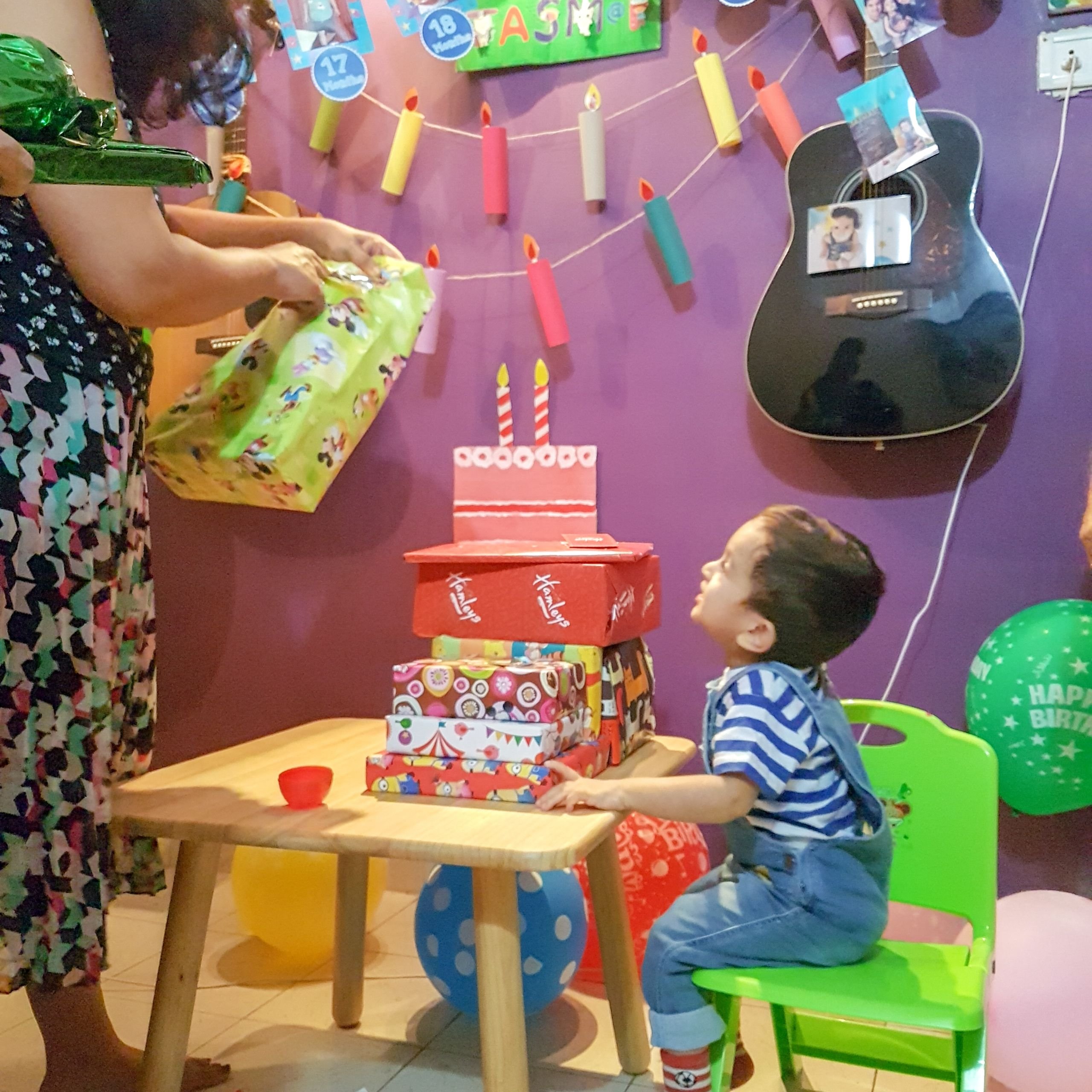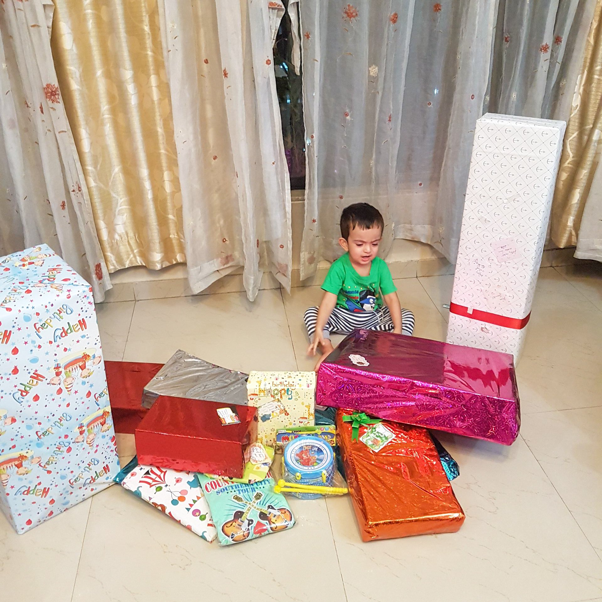 It was exactly this that we did not want to deny to our lil baby who was turning 2. Birthday gifting and receiving is pure joy and we wanted him to have it. The pictures here where he is surrounded by gifts and the joy of opening one and playing with it say it all.